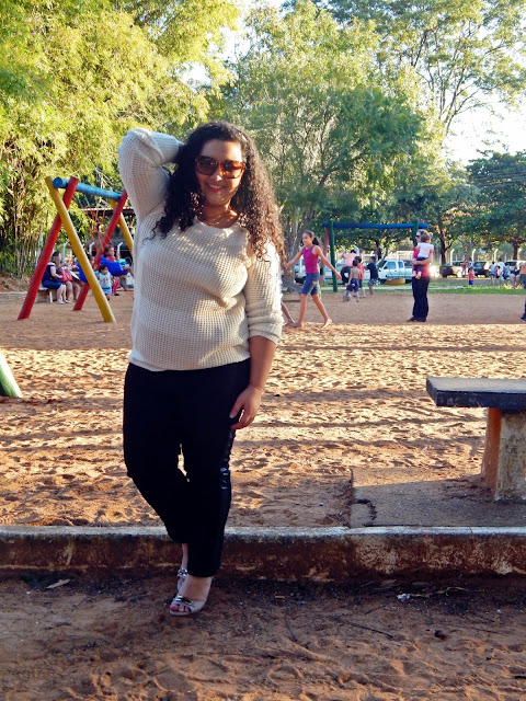 A blusa é uma delicia, super macia, tipo crochê nas cores branca e creme, e a calça toda estilosa com essa faixa na lateral em couro, na cor preta, e eu comprei na loja Marisa, no Shopping Araçatuba. Já o sapato eu ganhei de presente de aniversário da minha madrinha. E o óculos eu comprei em uma ótica aqui em Araçatuba também...ele sobreviveu ao meu acidente do final do ano, hehe!